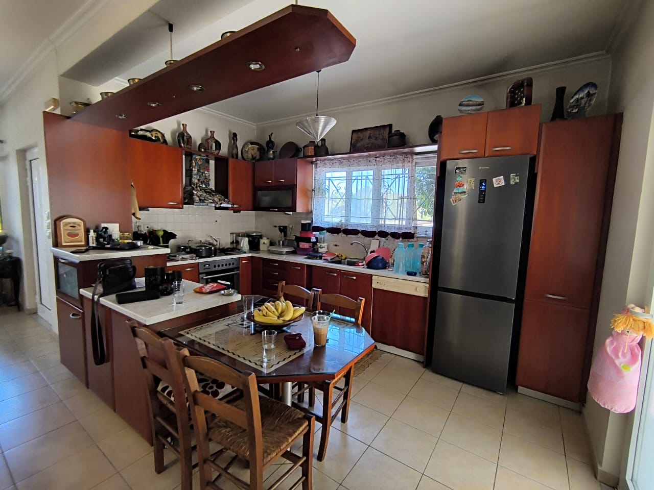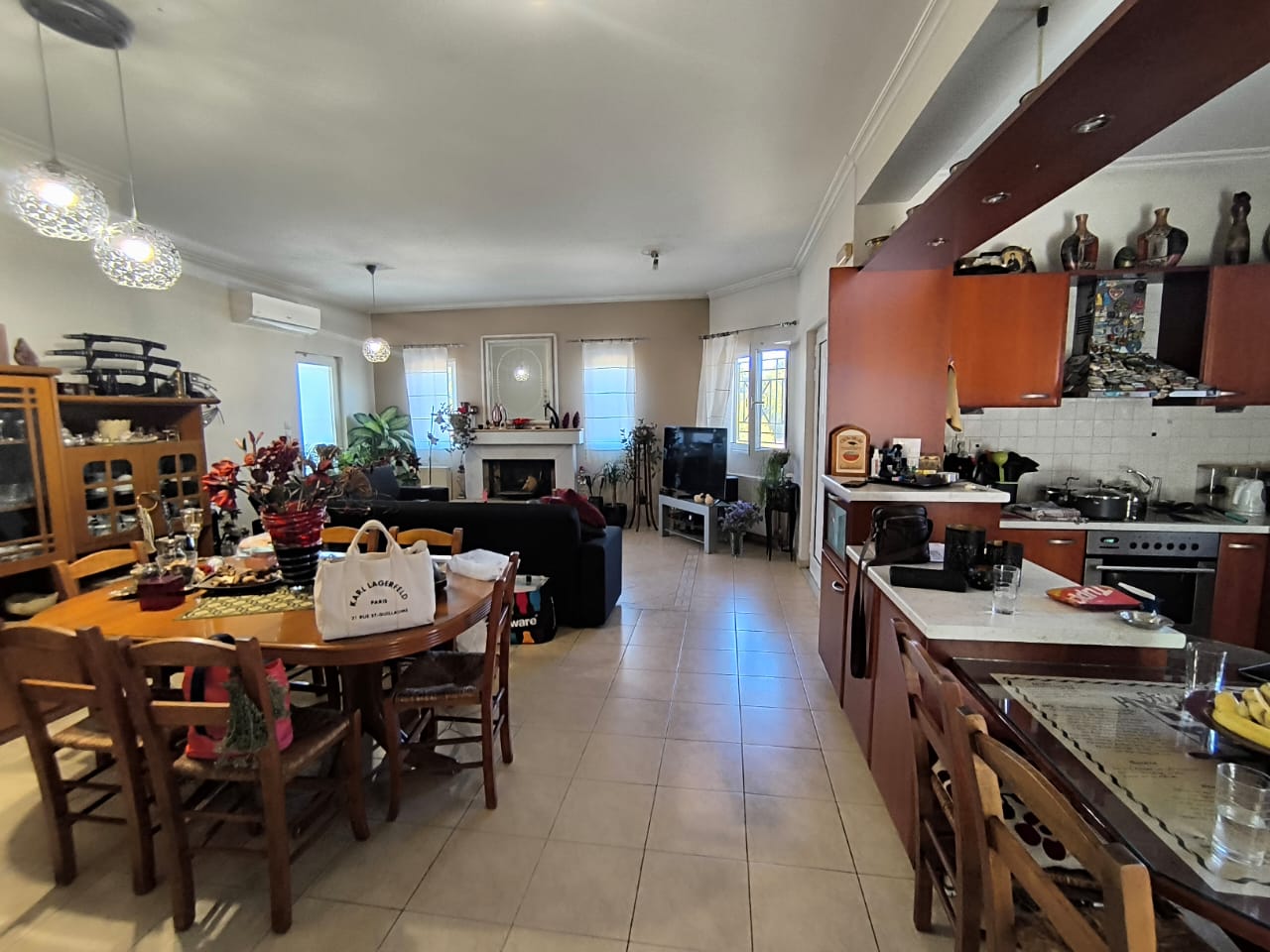 Built in 2002, the home spans 244 m² in total, consisting of an upper-level main residence and a ground-floor independent apartment. The upper floor includes 3 bedrooms (one en-suite), a bathroom, and an open-concept kitchen and living area with an energy-efficient fireplace. The lower level, with a separate entrance, features 2 bedrooms, a bathroom, and an open-plan living/kitchen area—ideal for guests, rental income, or extended family. The ground floor may require partial renovation.